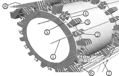 1─緯紗2─開口片3─打緯片4─上層梭口5─下層梭口6─經(jīng)紗片7─經(jīng)紗定位桿8─織物