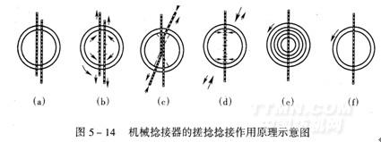 ⑥打開搓捻盤,把捻接好頭的紗線抽出來,完成全部機械捻接動作[圖5—14(f)]。