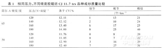 2.3 羅拉加壓不宜過大,一般控制在140 N/雙錠左右,并且加壓要穩(wěn)定,切勿重加壓,以免膠輥脫殼位移。表1為紡CJ11.7 tex紗,在相同壓力下使用不同硬度膠輥的成紗質(zhì)量對比。