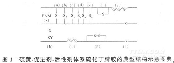 圖中:[a]單硫交聯(lián);[b)雙硫交聯(lián);[c]多硫交聯(lián)[x=3-6];[d]鄰位交聯(lián)[n=1~6];[e]引附屬于共同的或相鄰的碳原子上的交聯(lián);[f]橡膠分子內單硫環(huán);[g]橡膠分子內雙硫環(huán);[h]多硫—促進劑側基;[i]共軛二烯;[j]共軛三烯;[k]附加的網(wǎng)狀復物;[1]C-C交聯(lián)。