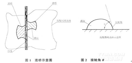 當(dāng)空氣中水分含量和氣壓不變的條件下,氣溫降低到使空氣達(dá)到飽和時的那個溫度稱為露點(diǎn)溫度(簡稱露點(diǎn)),氣溫降至露點(diǎn)以下,水汽發(fā)生沉降凝結(jié)現(xiàn)象,在車間過道、門等處由于冷熱交換最易發(fā)生此類現(xiàn)象,使膠輥表面形成水霧和纖維產(chǎn)生液橋吸附纖維。改性、預(yù)處理材料能降低膠輥表面張力,極大地減小膠輥表面對水的潤濕接觸角θ(見圖2),使水在膠輥表面充分散開抑制液橋產(chǎn)生。