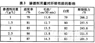 纖維素酶用量3g/L,EDTA用量2g/L,雙氧水及燒堿用量均為l0g/L,滲透劑JFC用量的影響見(jiàn)表3。