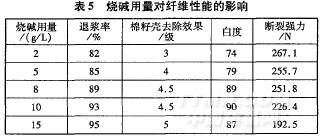 纖維素酶用量3g/L,EDTA用量2g/L,滲透劑JFC用量2g/L,雙氧水用量15 L,考察燒堿用量對(duì)前處理效果的影響,見(jiàn)表5。
