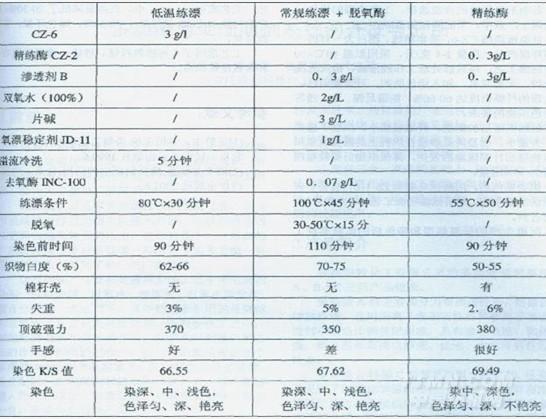 CZ-6低溫練漂的針織物,白度62-66%比常規(guī)氧漂差,但好于精練酶前處理,能滿足深、中、淺所有染色織物的要求。染色后織物的色澤均勻、艷亮,與常規(guī)氧漂染色性能相同。