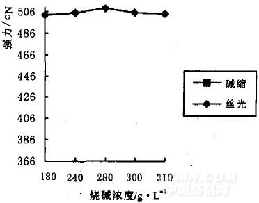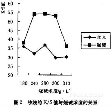 用8.5 teX燒毛紗線,燒堿,耐堿絲光滲透劑等;自制紗線絲光架,單紗強力儀,顯微鏡,測色儀等。紗線煮練按常規(guī)煮練工藝進行。用燒堿和耐堿絲光滲透劑配制不同濃度的絲光溶液此外,配制I2-KI溶液和1M的直接湖藍染液。