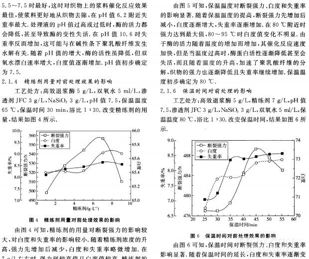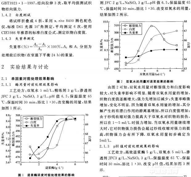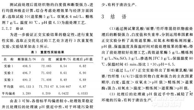 摘要:采用高效退漿酶一步法對聚乳酸/麗賽/竹(4/4/2)混紡織物進(jìn)行前處理,通過白度、斷裂強力和失重率指標(biāo)進(jìn)行評價,分別對高效退漿酶、雙氧水和精練劑的用量、pH值、保溫溫度和保溫時間進(jìn)行單因素實驗研究,得出合適范圍,通過I(4j)正交試驗,進(jìn)一步確定上述因素對前處理的影響,找出高效退漿酶一步法前處理最佳工藝.實驗結(jié)果表明高效退漿酶一步法前處理工藝能滿足聚乳酸/麗賽/竹混紡織物的后續(xù)生產(chǎn)要求并有利于清潔生產(chǎn).
