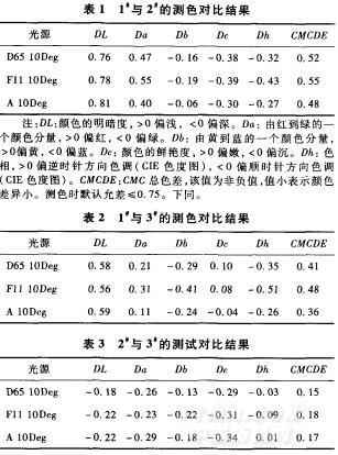 以1試樣作為標(biāo)準(zhǔn),2試樣測(cè)色對(duì)比結(jié)果見表1。以1試樣作為標(biāo)準(zhǔn),3試樣測(cè)色對(duì)比結(jié)果見表2。以2試樣作為標(biāo)準(zhǔn),3試樣測(cè)色對(duì)比結(jié)果見表3。