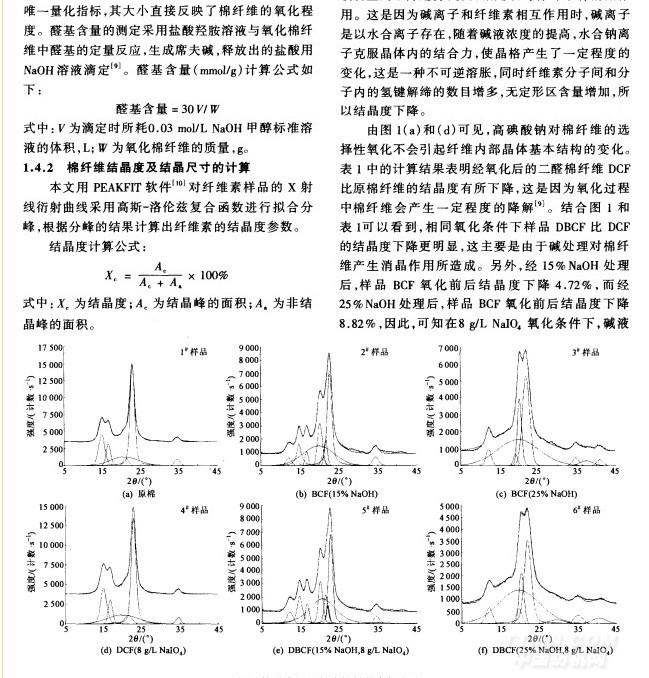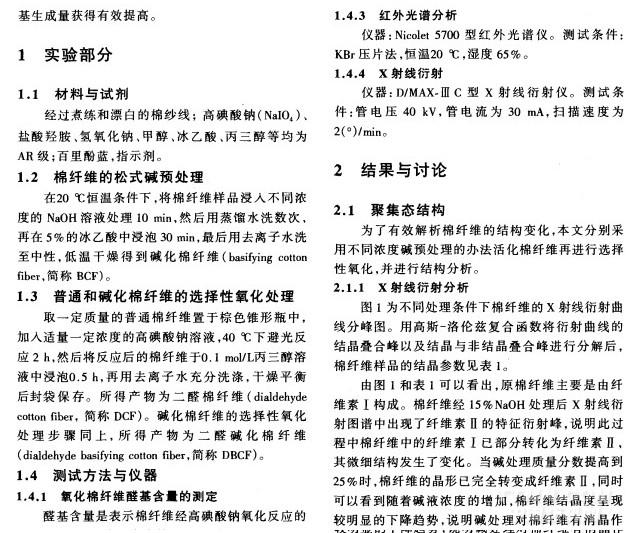 長期以來,濃堿大多被用于對纖維素的絲光化處理 。本文探索采用堿處理對棉纖維進行預(yù)活化加工,再采用高碘酸鈉對棉纖維進行選擇性氧化處理。利用堿對棉纖維的膨化作用,提高棉纖維的可及性和反應(yīng)性 ,從而在選擇性氧化后棉纖維的醛基生成量獲得有效提高