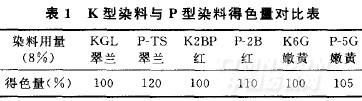 深色活性染料印花產(chǎn)品的特點(diǎn)是:顏色鮮艷,布邊潔白,不能染邊。常規(guī)印花工藝多采用K型、M型或KN型活性染料,而普通K型染料得色量低,難以達(dá)到深度,不適合印制深艷的花布;M型染料屬雙活性基結(jié)構(gòu),既含有一氯均三嗪活性基又含有乙烯砜活性基;KN型屬乙烯砜結(jié)構(gòu),它們印制時(shí),雖然得色量高,但對(duì)深色且要求鮮艷的顏色難以達(dá)到,特別是含乙烯砜結(jié)構(gòu)的染料,在堿性介質(zhì)中水解脫落硫酸脂,生成具有化學(xué)反應(yīng)能力的乙烯砜(D—sO一CH—CH。),才能和纖維素起加成反應(yīng)而結(jié)合。但是這種結(jié)合還不甚牢固,經(jīng)強(qiáng)堿和高溫,從纖維上落下的乙烯砜基和未印花部分的白底重新上染,而難以洗去,因此,深色印花白底較白的花型不易使用M型及KN型活性染料。為尋求得色量高,水洗容易,且浮色少的活性染料,本公司在優(yōu)選染化料方面,經(jīng)過大量的試驗(yàn)測(cè)試,拋棄了常規(guī)K型、M型、KN型等染料,選擇了進(jìn)口P型活性染料做印花之用。P型染料系一氯均三嗪結(jié)構(gòu),與國產(chǎn)K型染料屬同結(jié)構(gòu)染料,但進(jìn)口P型染料在固色率及提升力方面均優(yōu)于國產(chǎn)K型染料,特別適合印制深色且鮮艷產(chǎn)品,而且印花后水洗浮色輕,不易造成復(fù)染,以P—TS翠蘭與KGL翠蘭、P一2B紅與K2BP紅、P一5G嫩黃與K6G嫩黃為例,做對(duì)比測(cè)試,在相同的活性染料處方和同等條件下進(jìn)行印花,以K型染料作為基準(zhǔn),比較K型染料與P型染料得色量,結(jié)果見表l。