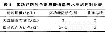 白布沾色實驗:把同樣大小的試樣(19.4/19.4268/268127cm純棉仿蠟大紅底或14.6/14.6378/378137cm純棉高密仿蠟深蘭底各兩塊),一塊放入盛有印花防沾色劑的燒杯中,一塊放入盛有一般皂液的燒杯中,進行皂洗,其皂洗時間、溫度一致,水洗烘干,做白布沾色試驗,按GB/251—1995標準用評定沾色用灰色樣卡評定,其白布沾色情況見表4。