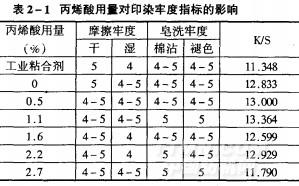 將不同用量的從作為自增稠單體加入,在其他條件不變的情況下,合成不同乳液用于涂料印花,并測(cè)試其印染指標(biāo)如表2~1所示: