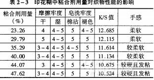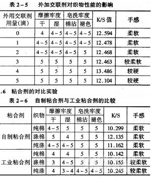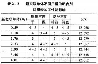 選用新聯(lián)單體合成粘合劑。由表2—3可知,粘合劑用量在30%,以下織物各項牢度很好,但粘合劑用量增大,干摩擦牢度反而下降,織物的手感變差,故選用粘合劑用量為總色漿29.27%時,色漿對織物的性能影響最小。