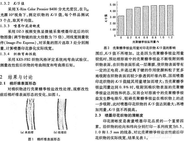 儀器 x.Rite Color Premier 8400分光光度儀(美國愛色麗有限公司),DZ一3視頻變焦顯微鏡(13本U—nion公司),KES.FB2織物風格評定系統(tǒng)純彎曲試驗儀(日本加藤技研株式會社),R210噴墨打印機(Ep—son公司),R-3焙烘箱(臺灣瑞比染色試機有限公司),HH-6數(shù)顯恒溫水浴鍋(金壇榮華儀器廠)。