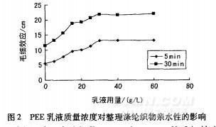 選取不同質(zhì)量濃度的PEE乳液,采用浸軋法處理滌綸織物,焙烘溫度150℃,焙烘時(shí)間60S,測定處理滌綸織物的毛細(xì)效應(yīng),結(jié)果如圖2。