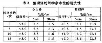 從表2看出,經(jīng)過l5次洗滌,處理滌綸織物仍表現(xiàn)較好的親水性,表明整理劑具有較好的耐洗性。