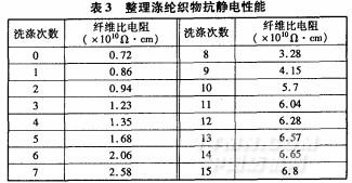 表3顯示,經(jīng)過(guò)PEE處理的滌綸織物纖維表面比電阻達(dá)到抗靜電要求(10加~1011n·cm以下),且經(jīng)l5次洗滌,仍具有抗靜電效果。