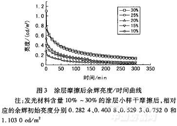 (1)夜光涂層余輝初始發(fā)光亮度隨發(fā)光材料添加量的增加而增大,但增加到一定程度,在相同的激發(fā)條件下,亮度趨于平緩。