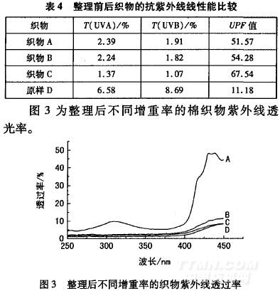 按上述復(fù)合整理工藝對織物進(jìn)行整理,選用整理后增重率分別為8.20%(A)、10.32%(B)和12.93%(C)3塊試樣進(jìn)行測試,整理前后織物的抗紫外線性能如表4所示。