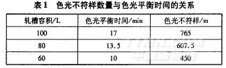 由式(2)可知,影響染液平衡的因素很多。色光平衡時間越短,車速越快,初開車不符樣數(shù)量就越低。例如,織物單位長度質(zhì)量為200g/m,帶液率為65%,車速45m/min時,色光不符樣數(shù)量與色光平衡時間的關(guān)系如表1所示。