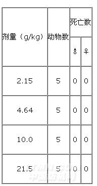 4.2.4.1試驗(yàn)方法:試驗(yàn)動(dòng)物為中國醫(yī)學(xué)科學(xué)院動(dòng)物中心提供的二級昆明種小鼠(合格證號為醫(yī)動(dòng)字第01-3001號),雌、雄各20只,體重為18-22克,按霍恩氏法選用經(jīng)口一次灌胃染毒,給藥前12小時(shí)禁食,給藥量最大體積為0.4ml/20g體重。染毒后觀察二周,記錄中毒癥狀及死亡時(shí)間,根據(jù)動(dòng)物死亡數(shù),從霍恩氏LD50計(jì)算表,求出LD50值及可信限。