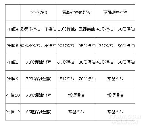 分析上述數(shù)據(jù)可以看出,不論是在強酸性條件還是堿性條件下,DT-7760表現(xiàn)出來的穩(wěn)定性都明顯優(yōu)于氨基硅油微乳液和聚醚改性硅油,這就使DT-7760的適用條件大為放寬,可應用于浸軋、浸漬、及噴灑工藝上。