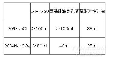 分析上述數(shù)據(jù)可以看到,與其他硅油乳液相比,DT-7760的耐鹽性能得到了大幅度的提升,尤其在耐Na2SO4方面更為突出。