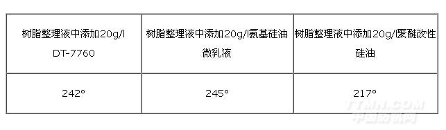 分析上述數(shù)據(jù)可以看到,在免燙樹脂整理中,經(jīng)過DT-7760整理后的彈性達到了氨基硅油的水平。
