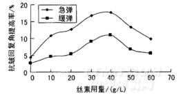 由圖1可看出,真絲經(jīng)絲素整理后,其折皺回復(fù)角隨絲素用量的增大而提高。這是由于檸檬酸為多元羧酸,能和絲素以及真絲織物中的羥基、氨基等發(fā)生反應(yīng),形成絲素、檸檬酸、真絲間的網(wǎng)狀結(jié)構(gòu)。隨著絲素整理劑用量的增加,纖維內(nèi)的共價(jià)交聯(lián)不斷增多,因此,真絲織物的折皺回復(fù)性提高。絲素用量超過40g/L時(shí),其急彈和緩彈折皺回復(fù)性有所下降,這是由于絲素用量過高,整理劑黏度過大,大部分絲素分子只能附著在纖維表面[4],不利于絲素、真絲和檸檬酸間的交聯(lián)反應(yīng),造成折皺回復(fù)性下降,織物手感變硬。因此,確定絲素用量為40g/L。