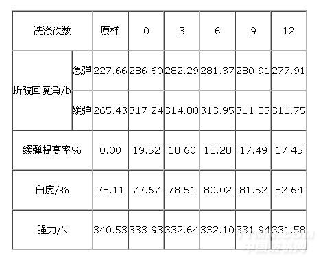 整理后織物折皺回復(fù)角增加,強力和白度下降不明顯。隨著洗滌次數(shù)的增加,折皺回復(fù)角值雖有降低,但仍比原樣高得多,說明經(jīng)過高溫焙烘后,絲素、檸檬酸在蠶絲織物上的固著比較穩(wěn)定,具有較好的耐洗性能。