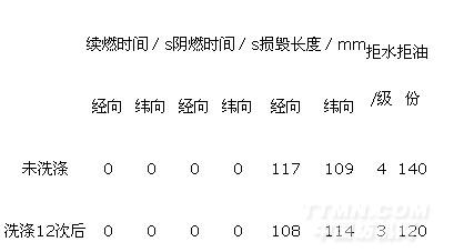 采用棉用耐久阻燃劑FK2103 300 g//L,F(xiàn)K2062交聯(lián)樹脂50 g/L,磷酸15 g/L和強(qiáng)力保護(hù)劑FK2074 30g/L,對(duì)純棉導(dǎo)電織物進(jìn)行阻燃整理,經(jīng)水洗后再采用拒水拒油劑FK2UFC02 60g/L進(jìn)行拒水拒油整理。整理后織物的垂直燃燒損毀長(zhǎng)度為110mm無陰燃和續(xù)燃,達(dá)到國(guó)標(biāo)B1級(jí)標(biāo)準(zhǔn):拒水達(dá)4級(jí),拒油達(dá)140分。電荷密度法測(cè)試其電荷密度為6.2 LC/m2:滿足GB 12014)1989中規(guī)定的帶電電荷量<0.6LC/件的要求。整理織物經(jīng)12次洗滌后,阻燃和抗靜電性能基本不變,拒水和拒油性能略有下降,但拒水仍可達(dá)4級(jí),拒油120分。