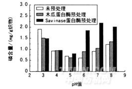 按1.2,2節(jié),分別用木瓜蛋白酶和Savinase蛋白酶對羊毛織物進行預處理,再按1.2.3節(jié)進行阻燃整理,考察酶種類和阻燃整理pH值對整理織物磷含量的影響,結(jié)果如圖2所示。