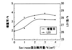 圖3 Savinase蛋白酶用量對增重率和LOI值的影響