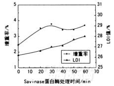圖4 Savinase蛋白酶處理時間對增重率和LOI值的影響