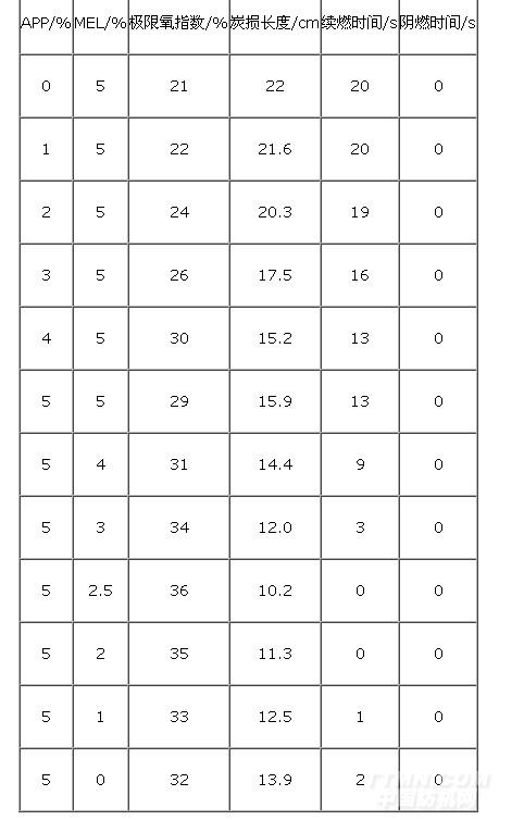 由表1看出,阻燃劑APP用量為5%時,整理后亞麻織物具有較好的阻燃性,阻燃效果基本達到國家標準的B1級。另外,在阻燃劑APP中加入適量的MEL,可提高亞麻織物的阻燃性。試驗表明,APP與MEL的優(yōu)化配比為2:1,炭損長度為10.2 cm,且離火即熄。