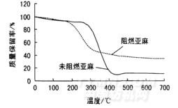 (2)常溫下,阻燃亞麻纖維表面被阻燃劑所覆蓋:200℃左右時阻燃劑開始分解,700℃時亞麻織物的質(zhì)量保留率為35%。阻燃亞麻織物的起始失重溫度、最大失重速率溫度均低于未阻燃整理織物,但其質(zhì)量保留率遠高于后者。