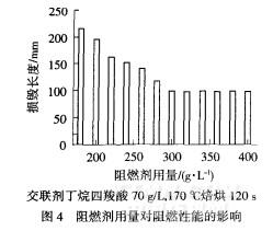 由圖4知,隨著阻燃劑用量的增加,阻燃性能提高.但當(dāng)阻燃劑用量增加到一定程度時(shí),阻燃性能不再提高,且織物的手感較差.同時(shí)阻燃劑用量過大,會(huì)增加成本.綜合考慮,阻燃劑用量以300g/L為宜.