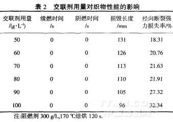 交聯(lián)劑用量直接影響阻燃劑與織物之間的交聯(lián)程度,同時(shí)對(duì)整理織物的強(qiáng)力影響很大.由表2可知,隨著交聯(lián)劑用量的增加,整理織物的損毀長度減小,經(jīng)向斷裂強(qiáng)力損失明顯.原因是隨著交聯(lián)劑用量的增加,阻燃劑與纖維之間的交聯(lián)較充分,織物的阻燃性能隨之提高.但交聯(lián)劑用量增大,整理液的酸性增強(qiáng),整理后的織物經(jīng)高溫焙烘易發(fā)生脆損,導(dǎo)致織物強(qiáng)力明顯降低.而且交聯(lián)劑用量過大,織物的手感明顯變差.因此,交聯(lián)劑BTCA用量選擇80g/L.