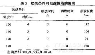 焙烘溫度、焙烘時(shí)間是影響阻燃整理的重要因素,直接影響阻燃劑與織物的交聯(lián).本試驗(yàn)主要以次亞磷酸鈉為催化劑,在一定溫度和時(shí)間下,使阻燃劑與棉織物發(fā)生交聯(lián),提高織物阻燃性能的穩(wěn)定性.因此,交聯(lián)反應(yīng)必須保證一定的時(shí)間和溫度,但溫度過高,時(shí)間過長織物的脆損嚴(yán)重,且織物的手感發(fā)硬.由表3損毀長度的結(jié)果可以看出,阻燃劑的焙烘條件應(yīng)選擇170℃、2min.