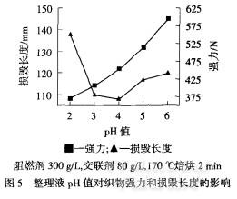 由于棉纖維耐堿不耐酸,在強(qiáng)酸性條件下強(qiáng)力損失嚴(yán)重.由圖5可知,隨著整理液pH值的增加,阻燃織物的強(qiáng)力呈增強(qiáng)趨勢,在pH=6時(shí)強(qiáng)力基本無損失(未阻燃織物強(qiáng)力值為603N).隨著pH值的增加,損毀長度先減小后增大,原因是當(dāng)pH<4時(shí),隨著pH值增大織物損傷減小,損毀長度也減??;而pH>4時(shí),pH值的增加不利于交聯(lián)反應(yīng)的進(jìn)行,使阻燃性能降低,損毀長度變大.綜合考慮強(qiáng)力和阻燃性能,整理液pH值選擇4~5.