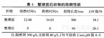 由表4可知,未經(jīng)整理的棉織物續(xù)燃、陰燃時(shí)間很長,且完全損毀.經(jīng)阻燃整理后損毀長度為94mm,續(xù)燃和陰燃時(shí)間均為0s,遠(yuǎn)小于阻燃機(jī)織物B1級(jí)標(biāo)準(zhǔn)(損毀長度≤150mm,續(xù)燃和陰燃時(shí)間≤5s).極限氧指數(shù)(LOI值)由18.1%增加到26.1%,表明整理織物阻燃性能良好.GB/T5455—1997測試方法規(guī)定火焰與織物接觸的時(shí)間為12s,但實(shí)際測試中發(fā)現(xiàn):火焰與織物.接觸6S時(shí),織物上火焰逐漸熄滅,不再燃燒.主要是因?yàn)楹鬃枞紕┰诨鹧嬷猩傻牧姿釋硬粨]發(fā),隔絕了空氣;同時(shí)產(chǎn)生的聚偏磷酸有強(qiáng)烈的脫水作用,使有機(jī)物炭化,生成的炭化膜也起到了隔絕空氣的作用捕獲活性大的HO·,阻止火焰的蔓延),從而使織物具有優(yōu)良的阻燃性能.
