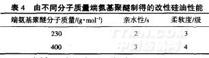由表4可以看出,端氨基聚醚分子質量為230時,改性硅油的親水性略好,而柔軟度則略差;端氨基聚醚分子質量為400時。親水性稍微下降,而柔軟度則好一級.所以,優(yōu)選端氨基聚醚分子質量為400,其原因是分子質量大的端氨基聚醚的聚醚鏈段更長,更容易彎曲,柔順性更好;該聚醚鏈段為聚環(huán)氧丙烷,具有一定的拒水性,其親水性要差些.