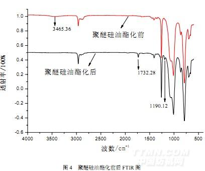 由圖4可知,聚醚硅油酯化前的紅外譜圖中,1061.6cm-1、1028.3cm-1180為聚醚硅油Si-O-Si的特征峰,1260cm-1、804.3cm-1為聚醚硅油Si-CH3的特征峰,3465.3cm-1為聚醚硅油—OH的特征峰。與酯化前聚醚硅油的紅外譜圖對比,酯化后聚醚硅油的紅外譜圖中,歸屬為聚醚硅油Si-O-Si的特征峰1061.6cm-1、1028.3cm-1均存在。但歸屬為聚醚硅油的—OH的特征峰3465.3cm-1在酯化后已經消失,并在1732.2cm-1出現(xiàn)了—C=O的特征峰以及在1190.1cm-1出現(xiàn)了—C-O-C的特征峰,表明酯化產物中有酯鍵生成。酯化產物在1600-1650cm-1未出現(xiàn)雙鍵特征峰,原因可能是雙鍵所占整個硅油的比例太低,吸收峰太弱不明顯所致。產物的紅外譜圖分析表明丙烯酸通過酯鍵接枝到聚醚硅油。
