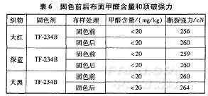 從表6可以看出,織物用固色劑TF-234B處理,固色前后布面甲醛釋放量<20mg/kg,而且其頂破強(qiáng)力也相差不大。