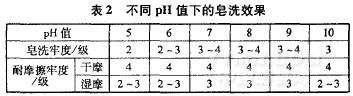 取JY一1103D用量lL,皂洗溫度7O℃,時(shí)間20min,浴比1:15,取不同pH值下的皂洗效果見表2。