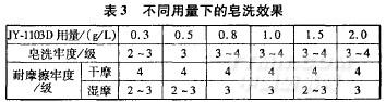 皂洗工藝條件同上,不同JY一1103D用量下的皂洗效果見表3。