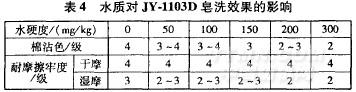 取JY一1103D用量為1g/L,皂洗溫度7O℃,時(shí)間20arin,浴比1:15,不同硬度水中的皂洗效果見表4。