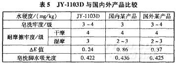 在pH值7~8,水硬度為100~150mg/kg,皂洗劑用量1g/L,皂洗溫度70℃,時(shí)間20min條件下,將JY一1103D與國內(nèi)外同類產(chǎn)品進(jìn)行比較,結(jié)果見表5。