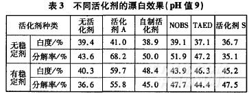 由表3可以看出,在80oC、pH值9且無穩(wěn)定劑的條件下,除活化劑s以外,其它幾種活化劑對雙氧水的分解均有較明顯的促進作用。從白度上看,與空白樣相比,僅有活化劑A對織物的白度有一定的提升;而活化劑NOBS、TAED和活化劑S的加入,都使織物白度有一定的下降。因此,漂白條件為80℃、pH值9時選用活化劑A。但是活化劑A對雙氧水分解率的提高程度遠遠大于對白度的提高程度,這可能是由于1.2X10-3g/L的質量濃度對活化劑A來說已經(jīng)過量,導致雙氧水分解迅速。