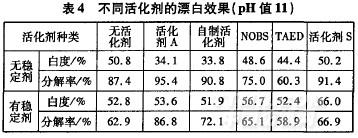由表4可以看出,不加入穩(wěn)定劑時,在8O℃、pH值11條件下,不論是否加人活化劑,試樣均有較高的雙氧水分解率,達到85%以上。而當漂液中加入穩(wěn)定劑以后,織物白度明顯提高,雙氧水的分解得到了有效控制,漂白能力提高。從表4還可以看出,活化劑S有更明顯的促漂作用,尤其是當加人穩(wěn)定劑之后,加入活化劑S的試樣白度比其它試樣要高1O個百分點。因此,漂白條件為80℃、pH值11時,選用活化劑S。