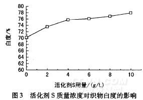 取穩(wěn)定劑D質(zhì)量濃度為4g/L,按2.2節(jié)漂白工藝處理棉織物,考察活化劑s質(zhì)量濃度對(duì)織物白度的影響,如圖3所示。